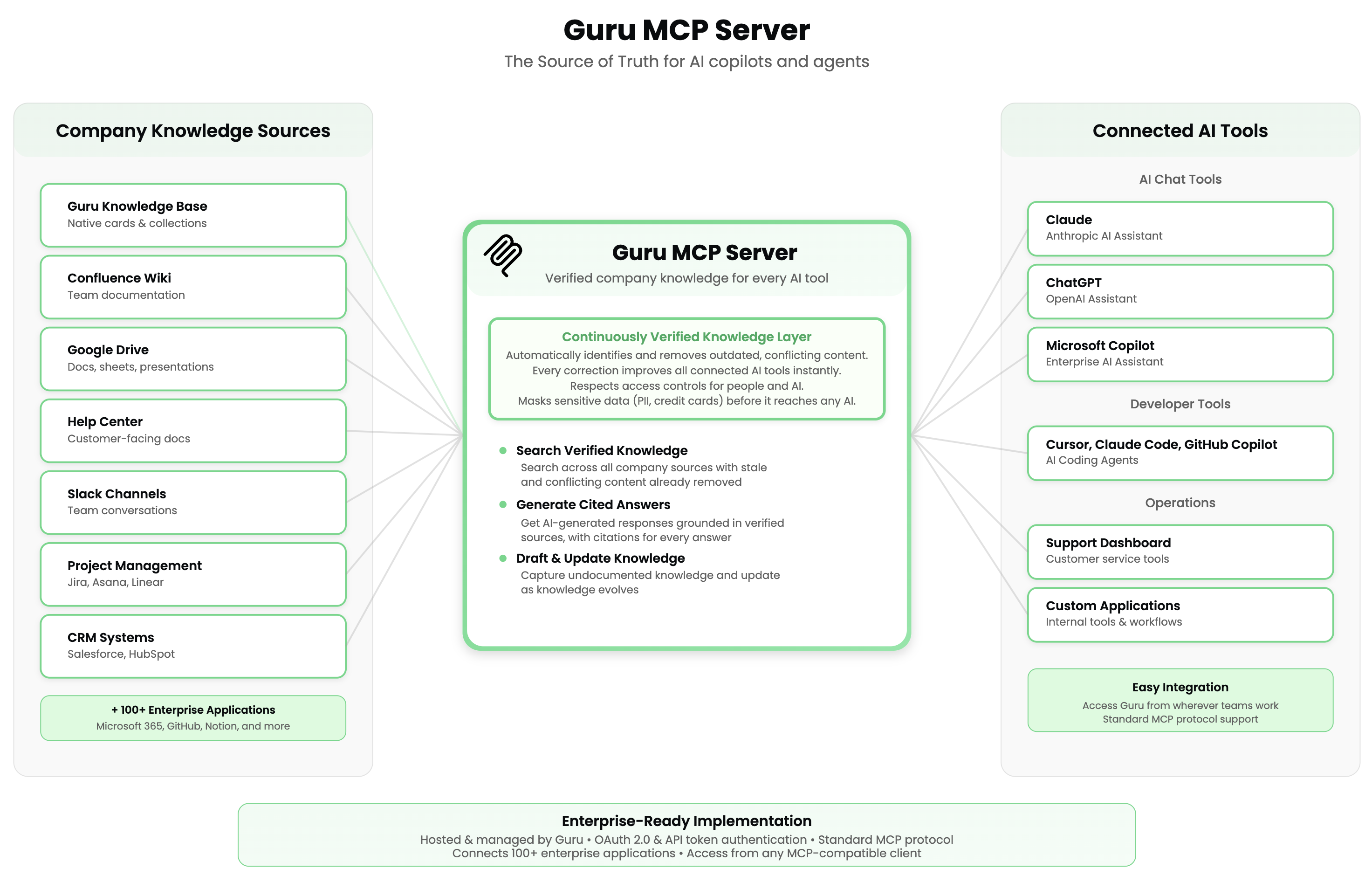 When you connect through MCP, you're tapping into everything connected to Guru, including all your Sources like Salesforce, Slack, Google Drive, Confluence, and SharePoint. MCP respects all existing permissions and logs every query in the AI Agent Center.