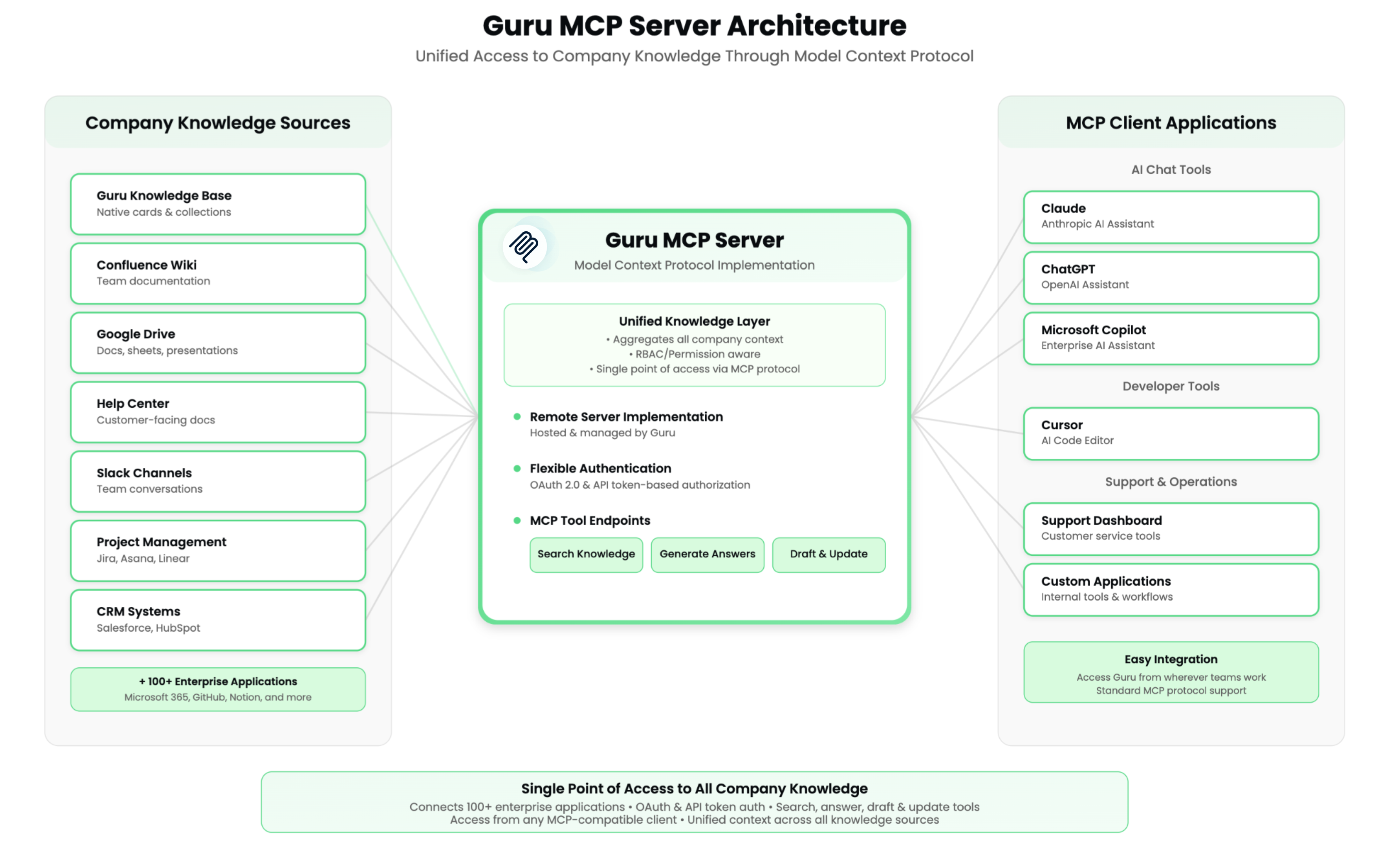 By establishing this connection, users leverage all content connected to Guru— not just Guru Cards, but also your connected Sources (like Salesforce, Slack, Google Drive, Confluence, and SharePoint.) This integration enhances productivity by enabling AI tools to surface accurate, real-time knowledge from across the organization.