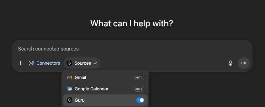 Note: The Guru connector to ChatGPT currently only supports searching for content. Additional functionality (editing and drafting Guru content) is pending approval and should be available soon.