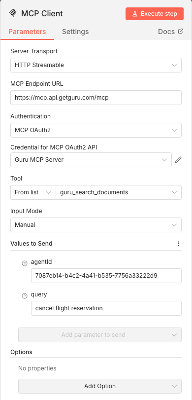 - Now you are ready to use Guru's MCP server in your n8n workflow. Choose the MCP Client node and enter https://mcp.api.getguru.com/mcp as the MCP Endpoint URL.
