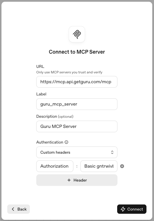 - Click Connect - this will establish the connection to Guru's MCP server